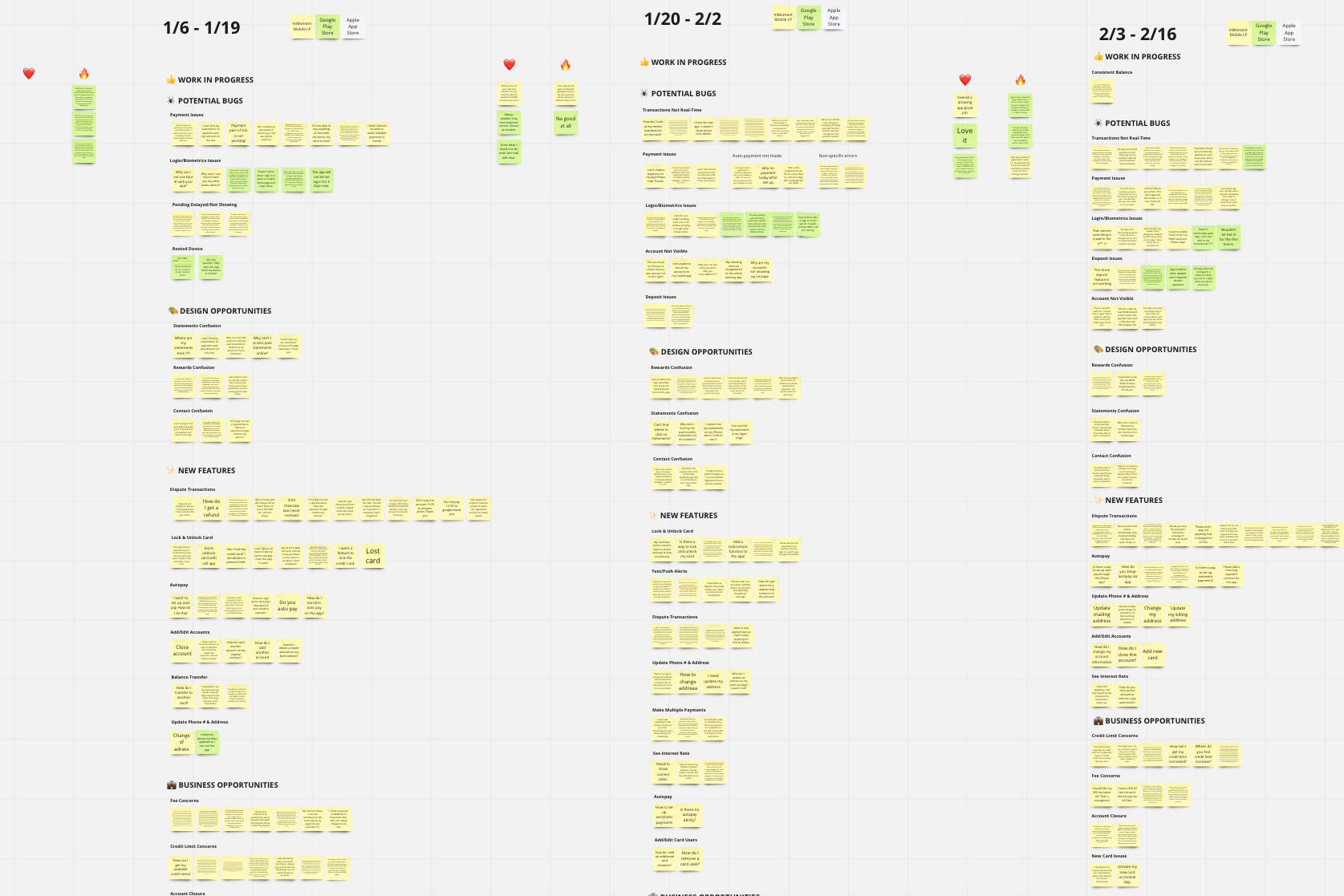 Over an 18 month period, I regularly gathered user feedback from within the app and from the app stores. This gave me a good idea of what features were still missing and where pain points were occurring with current features. I performed extensive competitive analysis by looking at the mobile apps of other large banks and noticed patterns emerge.