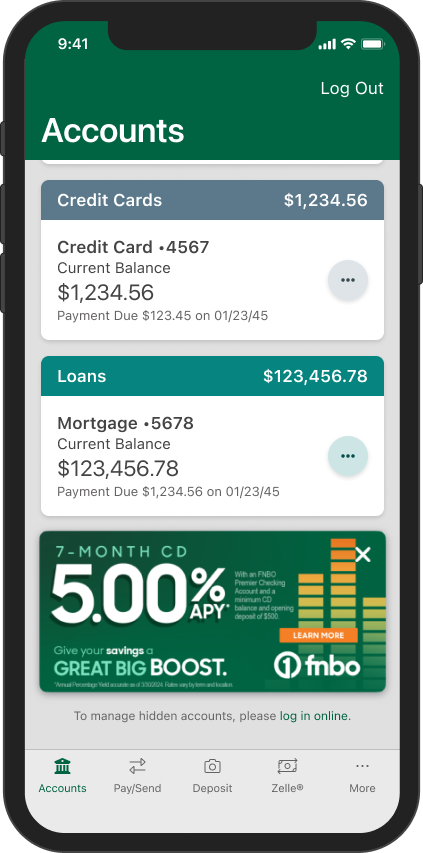 As a senior product designer at First National Bank of Omaha (FNBO), a large regional bank, I led the effort to update the design of the existing mobile banking app.