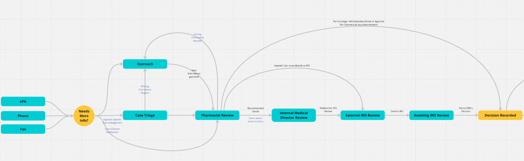 Although I already had experience working in the health insurance industry, I was less familiar with the process of prior authorizations. My first task was to immerse myself in all of the documentation, journey maps, and user feedback that the product team had already accumulated.